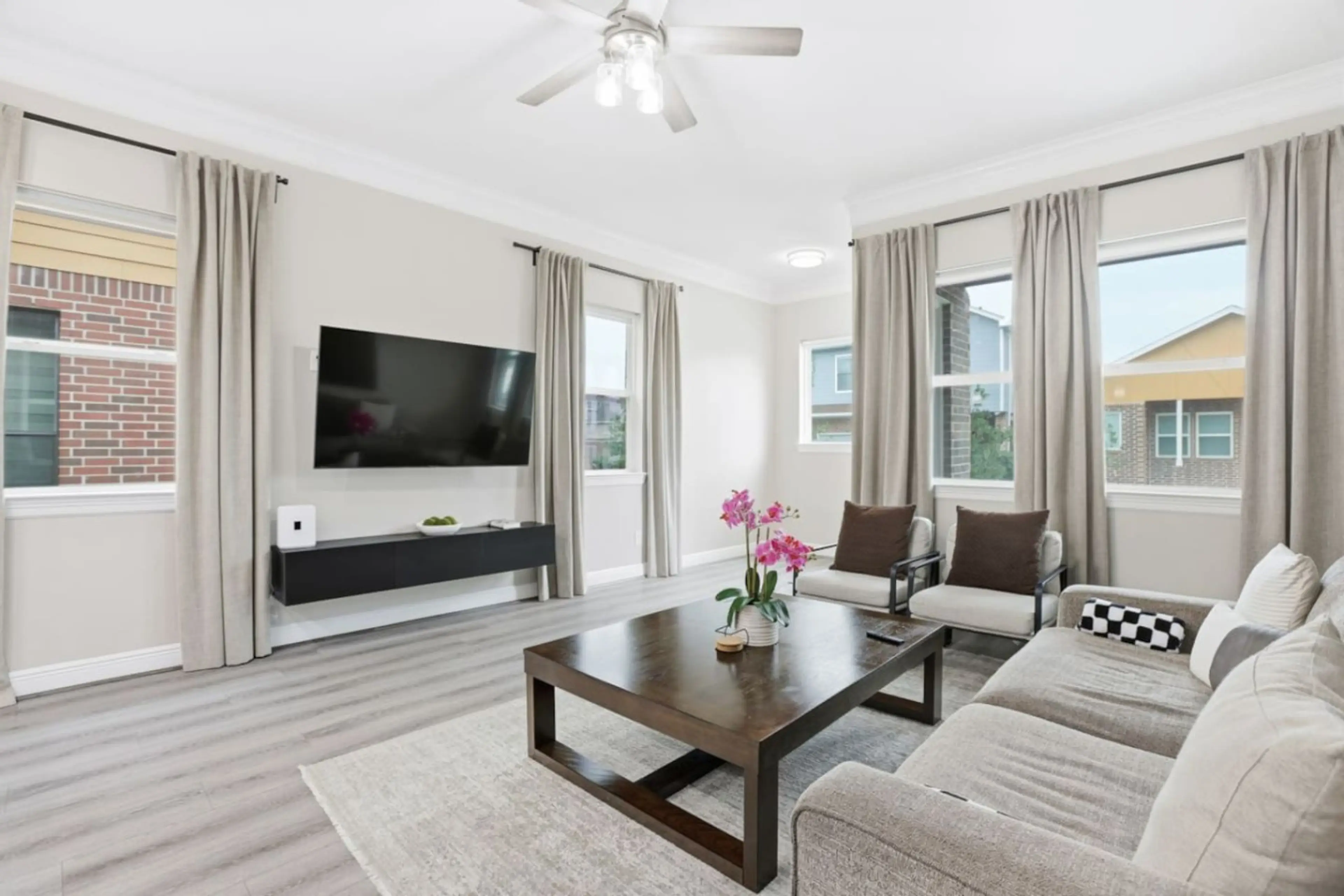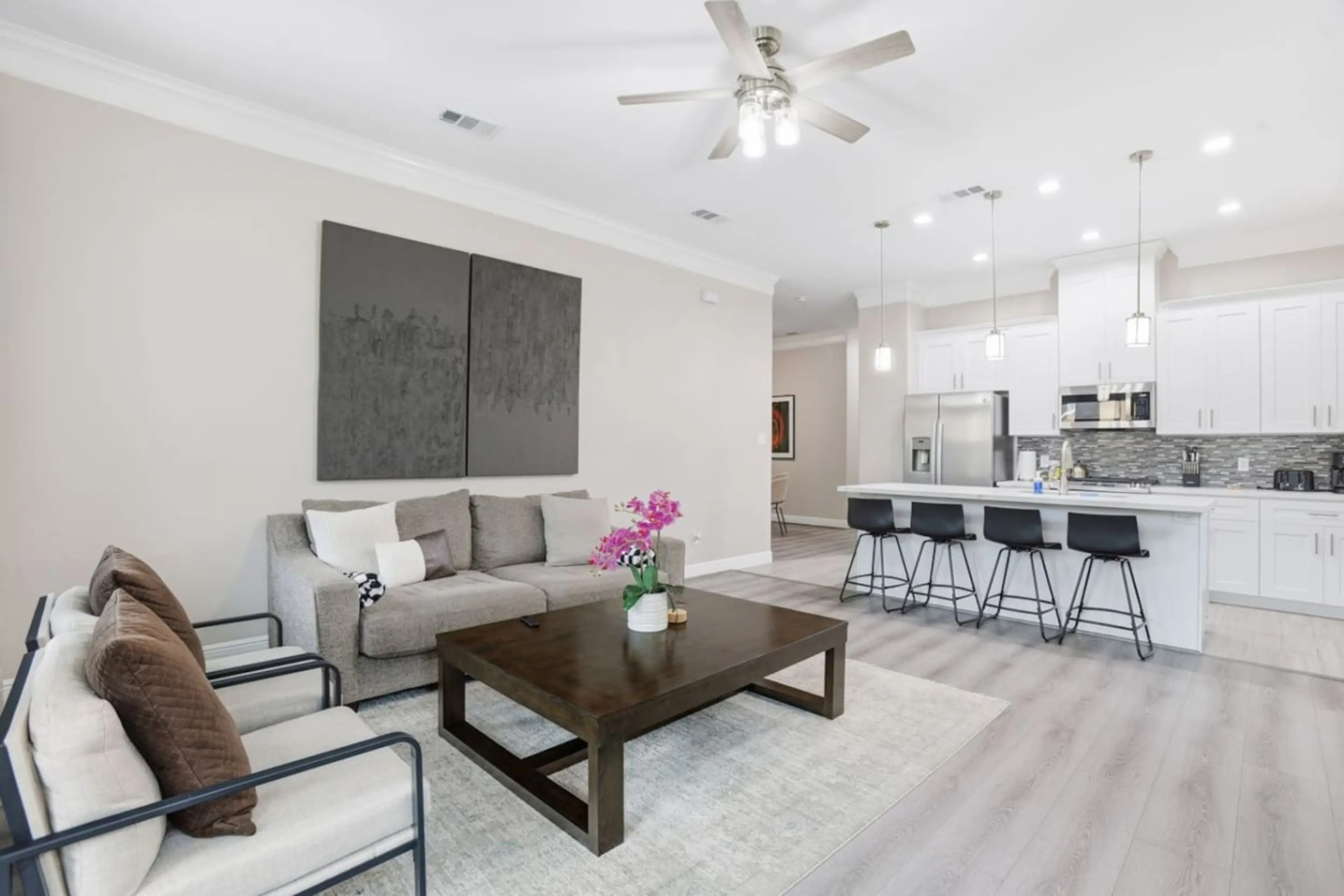 Single-story 2BR townhome in Southwest Houston, perfect for extended stays. Features king beds, fast WiFi, a work-friendly layout, and a fully equipped kitchen. Pet-friendly with a fenced backyard, plus driveway and garage parking in a quiet gated community with easy access to major roads and busine...